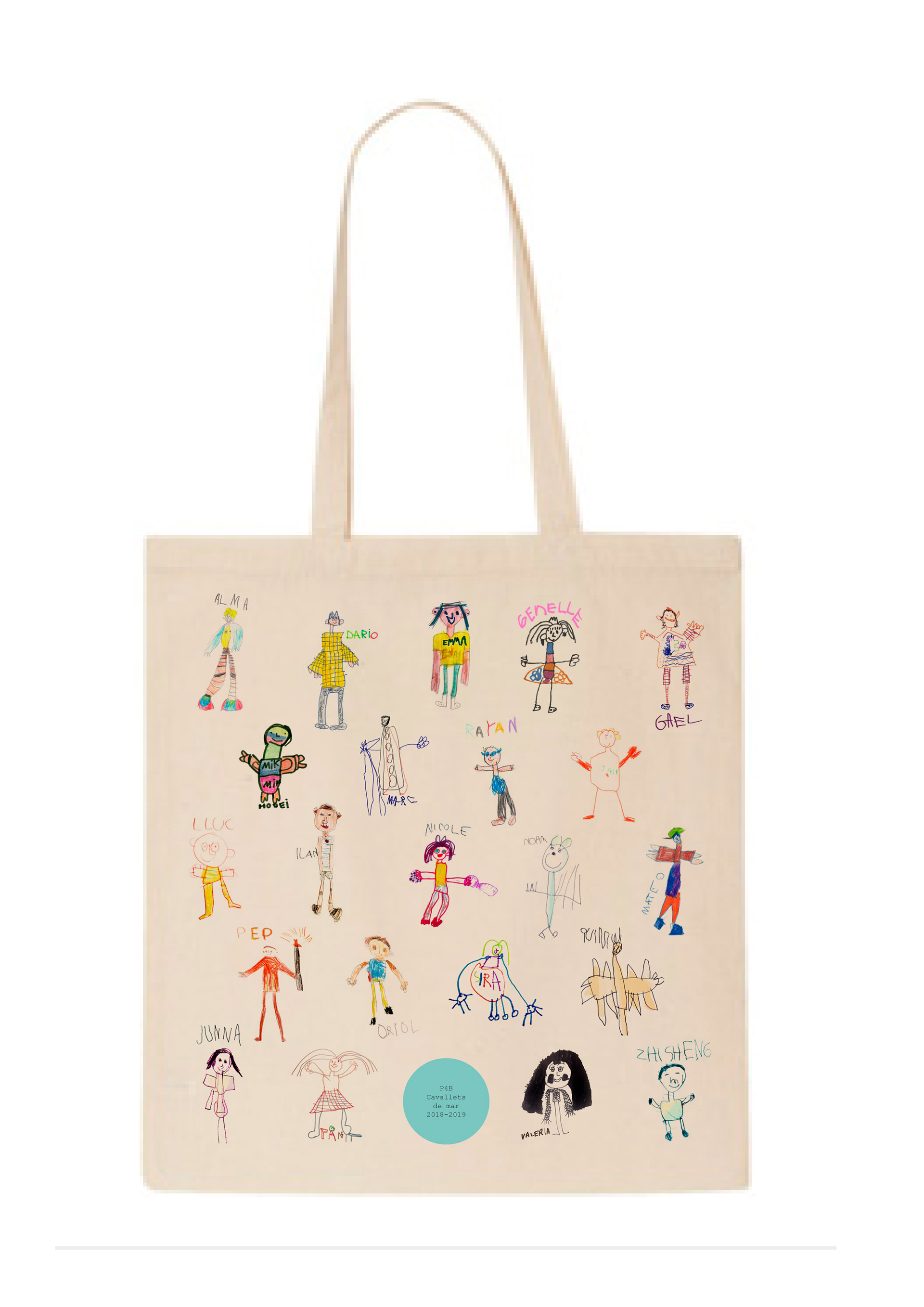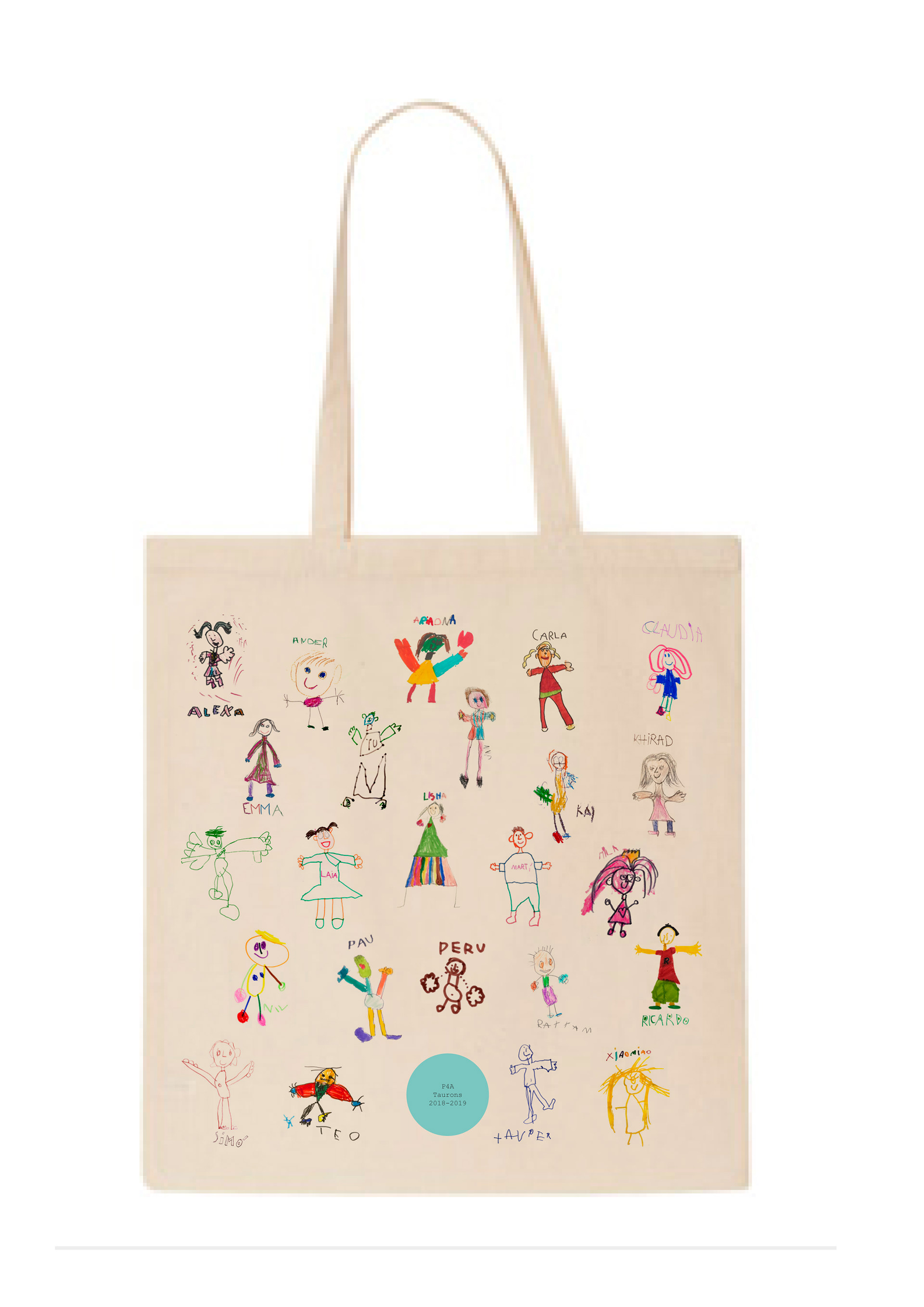 Diseño y montaje de Totes con ilustraciones de las niñas y niños de P4 como regalo corporativo escolar.